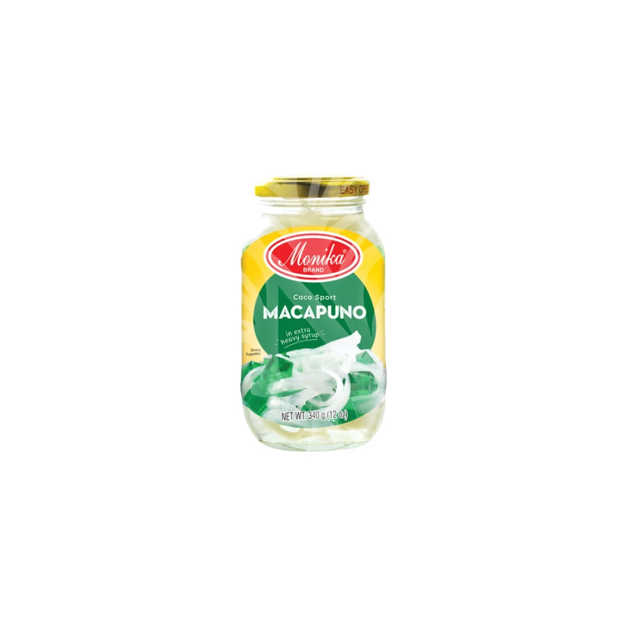 A Monika Macapuno (Coco Sport) in Heavy Syrup a Fülöp-szigetek egyik legkülönlegesebb desszertalapja, amely a híres „macapuno” kókuszfajta természetes édességét és selymes textúráját kínálja. A macapuno egy különleges, természetesen édes és puha húsú kókusz, amelyet kézzel dolgoznak fel, majd gazdag cukorszirupban tartósítanak, hogy megőrizze trópusi ízét és aromáját.