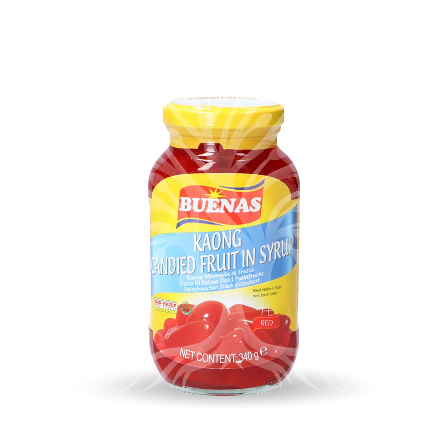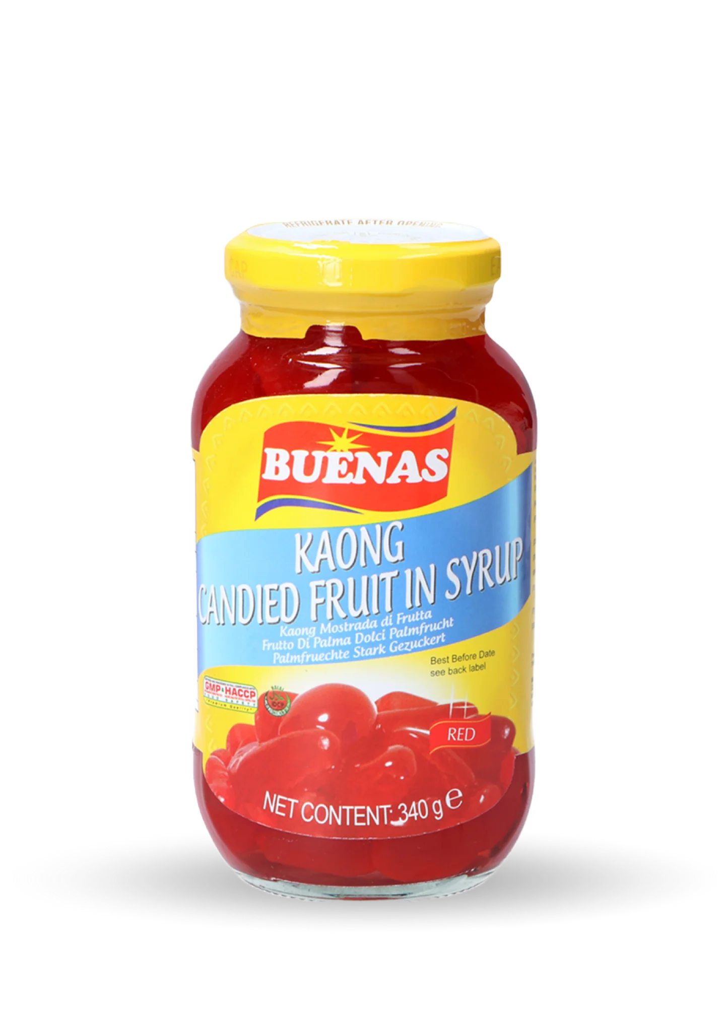 A Buenas Kaong Red (Sugar Palm Fruit) a Fülöp-szigetek egyik legkedveltebb trópusi desszertalapja, amely a cukorpálma gyümölcséből készül. A gyöngyszerű, félig áttetsző kaong szemeket piros színű cukorszirupban tartósítják, amely nemcsak ízében, de megjelenésében is különleges.